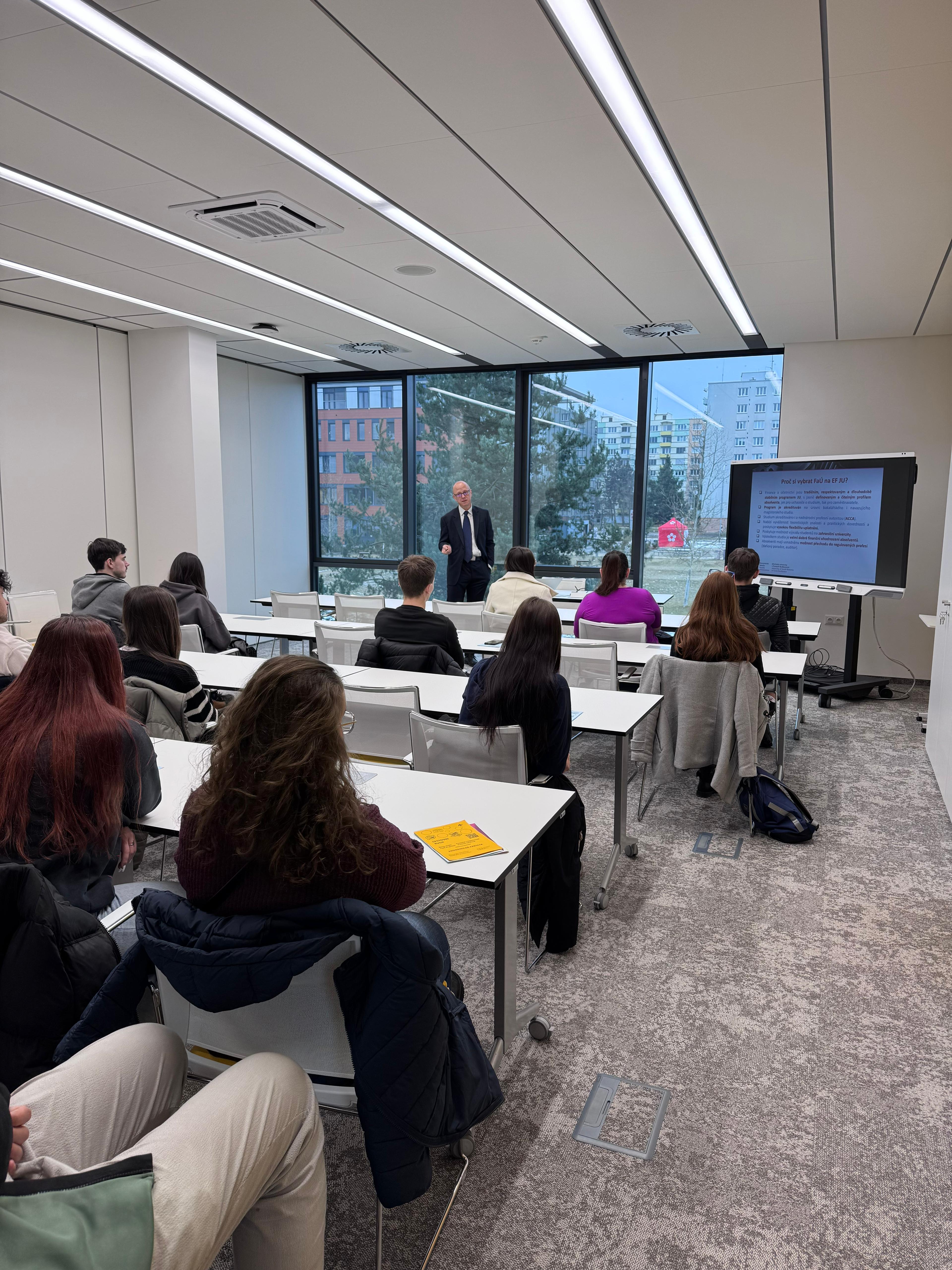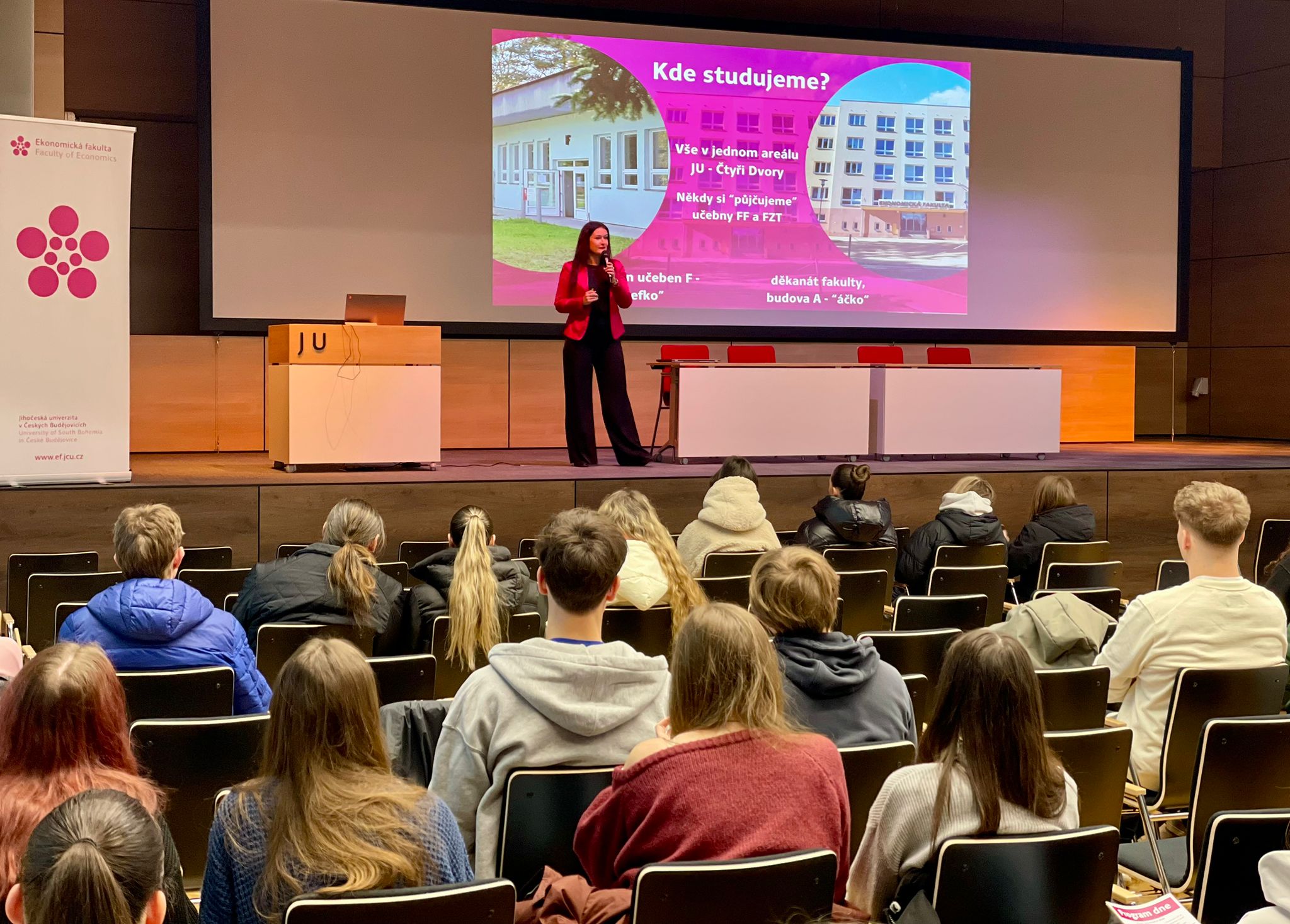 Součástí programu byla také prohlídka fakultních prostor, informace o zahraničních mobilitách, studentských aktivitách a možnostech zapojení do projektů či soutěží. Ukázalo se, že uchazeče dnes nezajímá jen obsah studijního plánu, ale i prostředí, komunita a reálné propojení studia s praxí – a právě v těchto oblastech má EF JU co nabídnout.