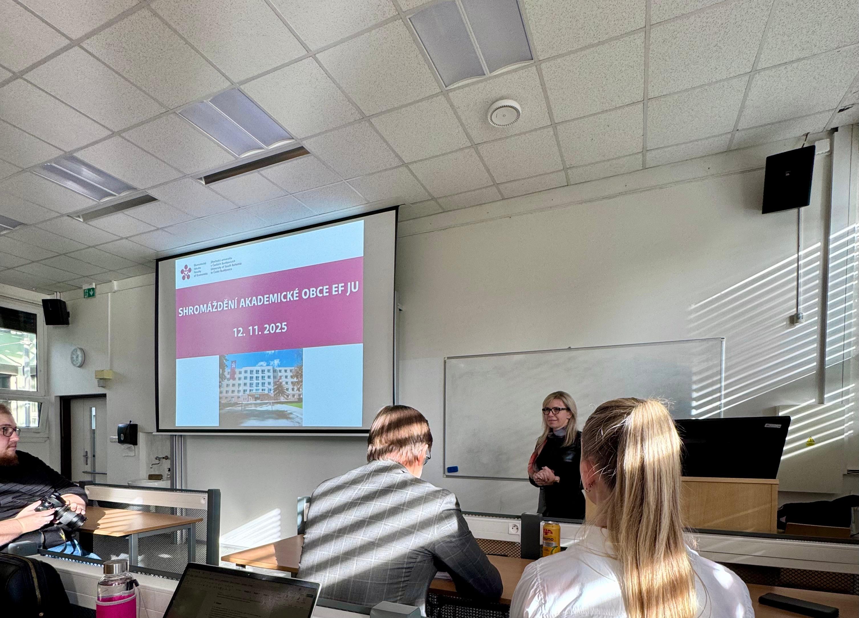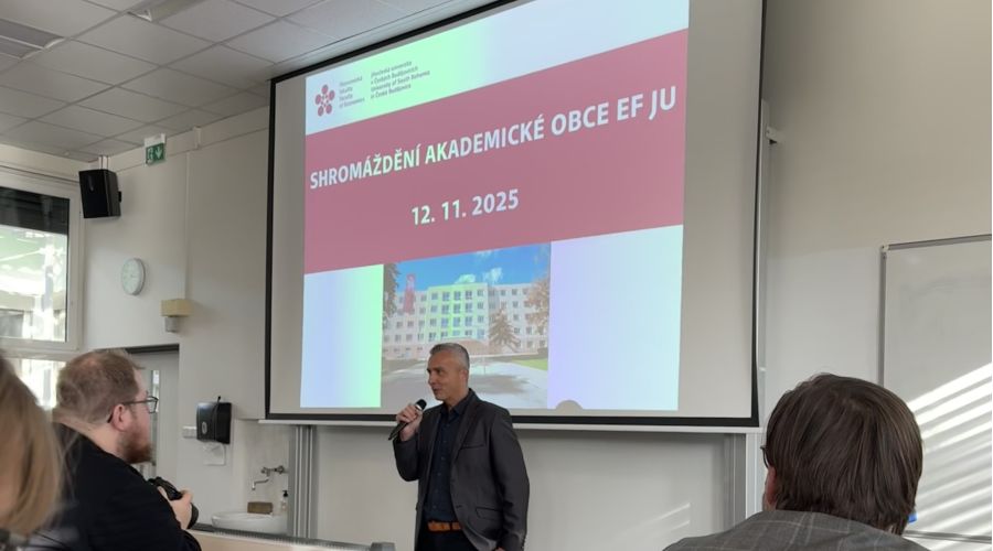 Ve středu 12. listopadu se v učebně F3 na Ekonomické fakultě Jihočeské univerzity uskutečnilo Shromáždění akademické obce EF JU. Setkání, které tradičně nabízí prostor pro sdílení informací a debatě o aktuálním dění na fakultě i v jejích orgánech, přilákalo akademiky, zaměstnance i studenty se zájmem o směřování fakulty.