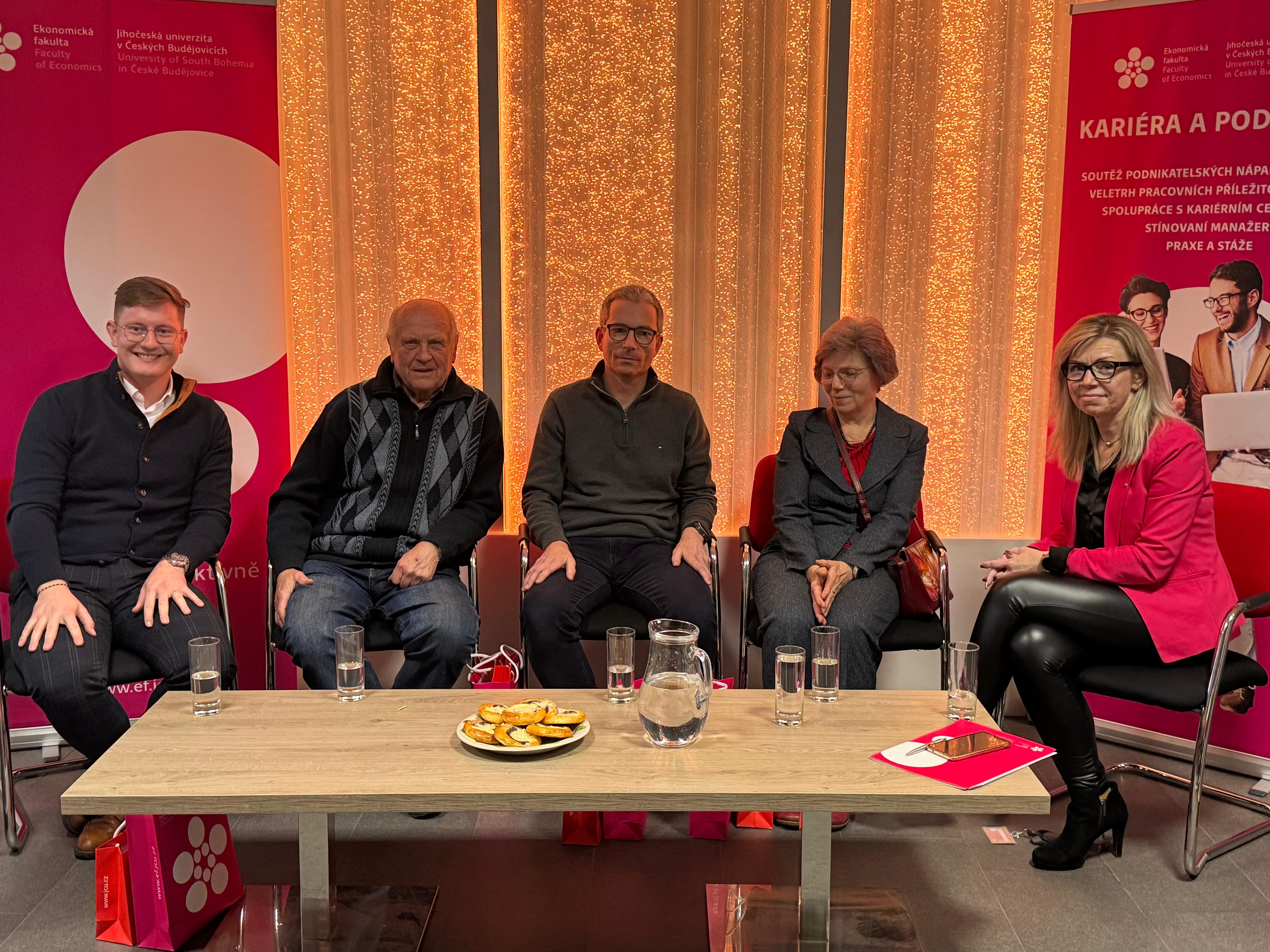 Zlatým hřebem celého týdne byla úterní panelová diskuse Za oponou rodinného podnikání II., která se uskutečnila ve foyer děkanátu EF JU. Diskusi moderovala děkanka fakulty doc. RNDr. Zuzana Dvořáková Lišková, Ph.D., a její průběh nabídl kombinaci inspirativních postřehů, zajímavostí z praxe i osobních příběhů plných emocí.