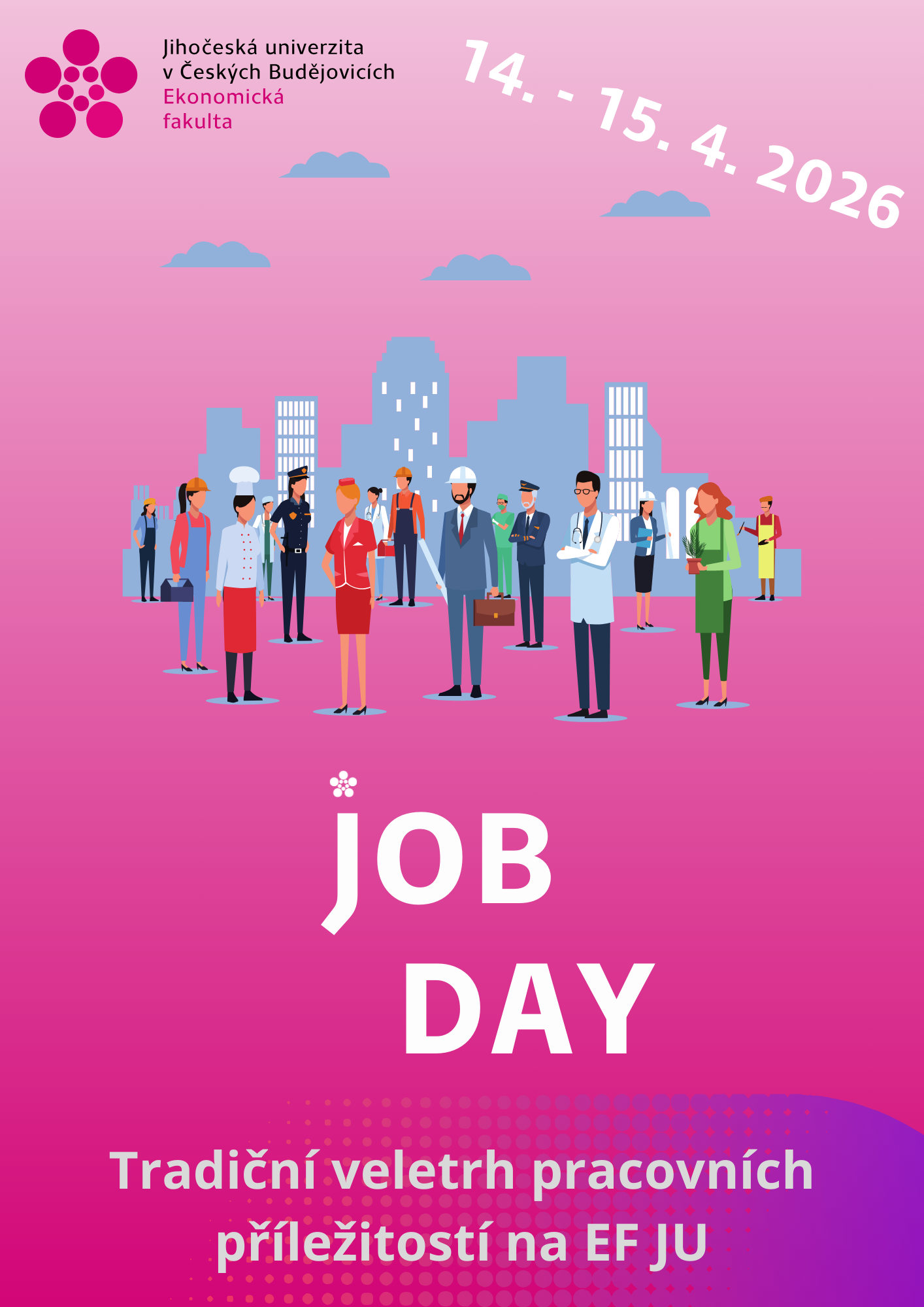 Dvoudenní veletrh pracovních příležitostí JOB DAY je nejen nabídkou pracovních míst pro studenty, ale i místem, kde se mohou studenti potkat s personalisty významných firem. Cílem akce, konané tradičně v průběhu dubna, je zprostředkování kontaktu mezi studenty a zástupci významných zaměstnavatelů. Jde o jedinečnou příležitost, jak oslovit potenciální zaměstnance nebo uchazeče o stáže a trainee programy z řad všech studentů celé Jihočeské univerzity.