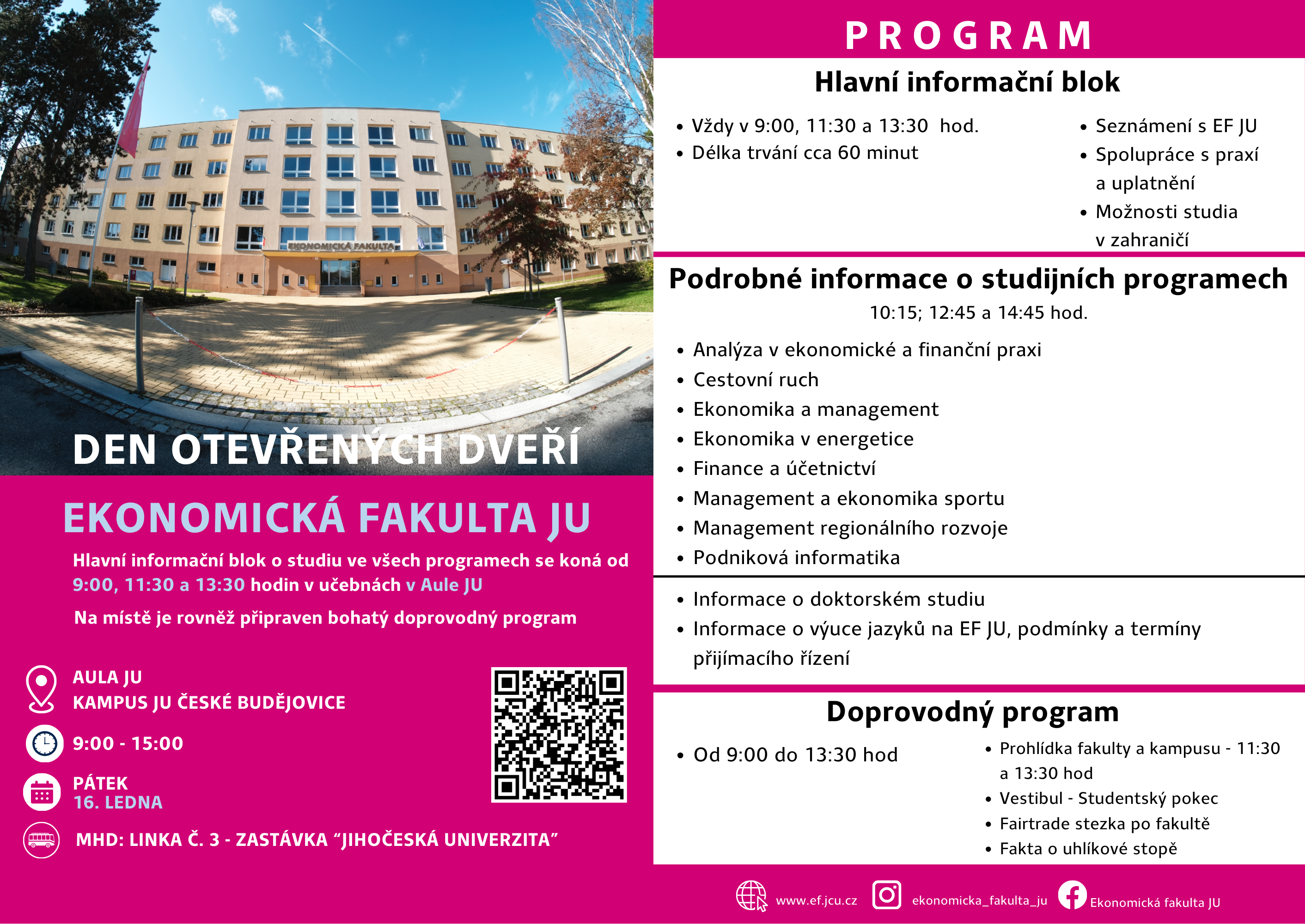 Ekonomická fakulta Jihočeské univerzity v Českých Budějovicích srdečně zve všechny zájemce o studium, jejich rodiče i širokou veřejnost na "Den otevřených dveří", který se koná 16. 1. 2026 od 9:00 - 15:00 v budově Děkanátu Ekonomické fakulty JU, Studentská 787/13, České Budějovice.