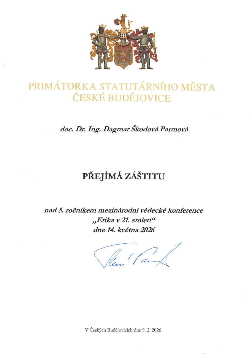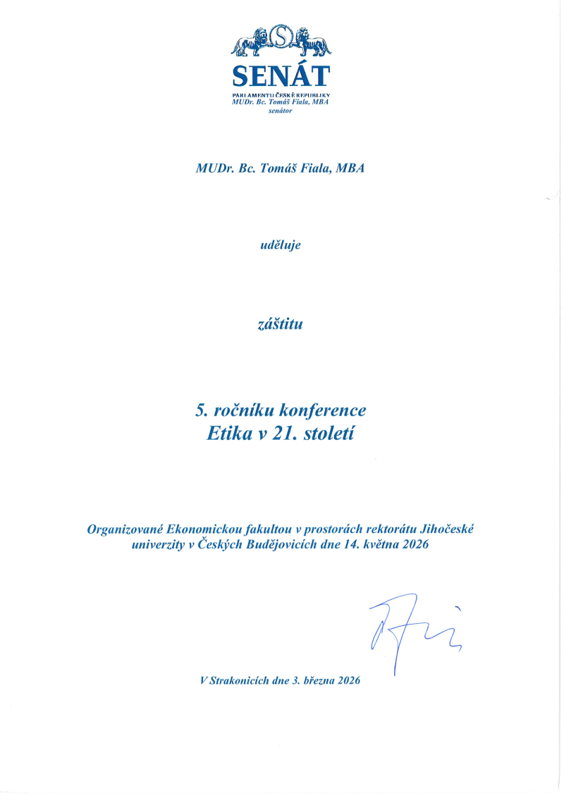Ekonomická fakulta Jihočeské univerzity v Českých Budějovicích pod záštitou záštitou senátora Parlamentu České republiky MUDr. Bc. Tomáše Fialy, MBA, primátorky statutárního města České Budějovice doc. Dr. Ing. Dagmar Škodové Parmové a děkanky Ekonomické fakulty Jihočeské univerzity v Českých Budějovicích doc. RNDr. Zuzany Dvořákové Líškové, Ph.D., Vás srdečně zve na 5. ročník konference Etika v 21. století.
